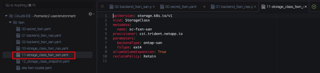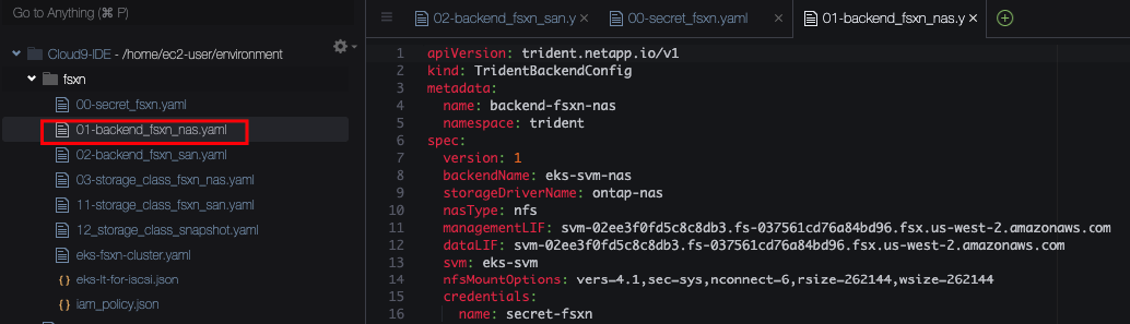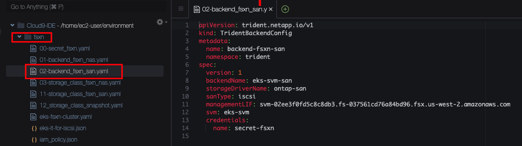 We have prepared configuration manifests for you already. These are generated to match your specific AWS environment with correct networking and credentials. In your Cloud9 Editor, please open the folder fsxn